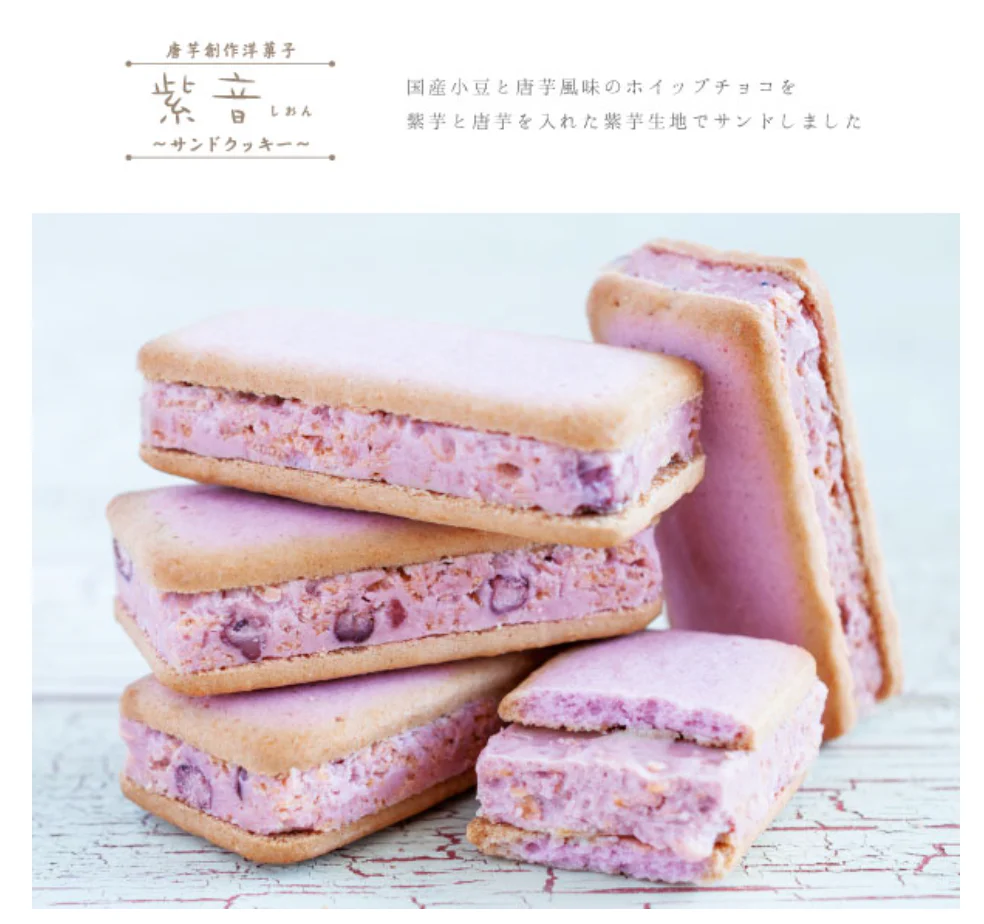 国産小豆と唐芋風味のホイップチョコを、紫芋クッキーでサンドしたもので、